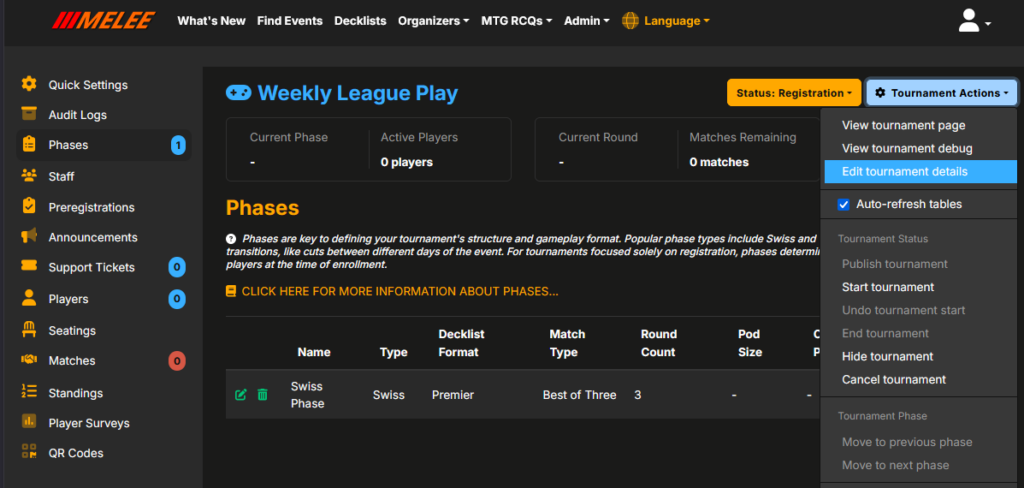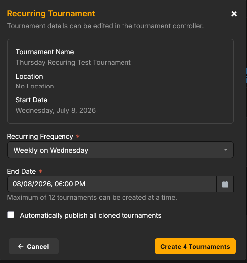 If you’re looking to duplicate a tournament a single time or generate multiple clones for a weekly recurring tournament, Melee’s got you.