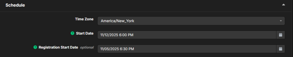 - Registration Start Date: For weekly recurring tournaments, it’s important to set a date for when players can begin registering AFTER the start of the prior week’s tournament. This will ensure any players registering online are doing so in the appropriate copy of the tournament. An example, where we are allowing registration 30 min after the previous week’s event has started: