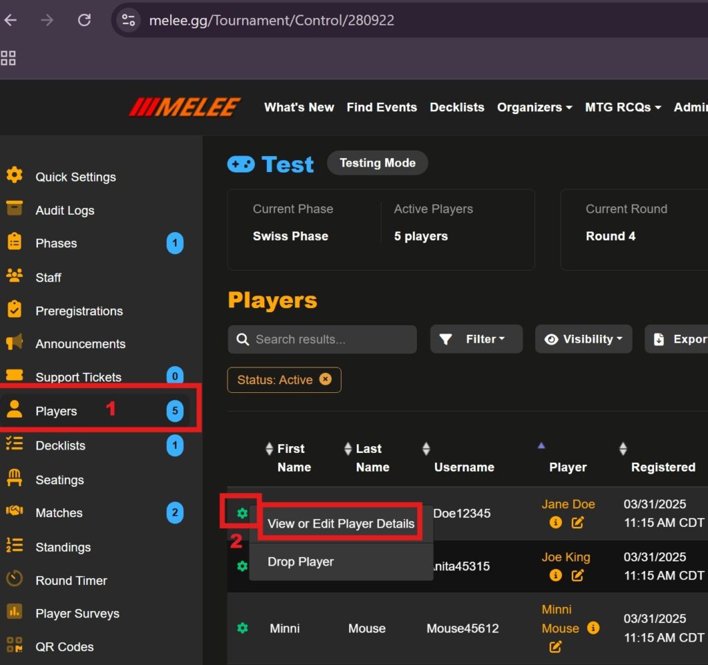 - (1 and 2) From the players tab, click the cog next to the player’s name who’s seat you would like to fix and select “View or Edit Player Details”.
