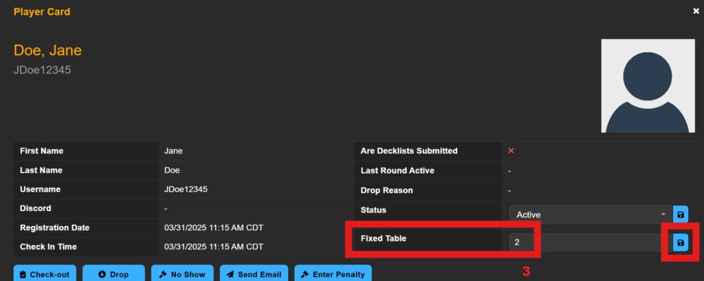 - (3) In the Player Card, add the appropriate table # in the “Fixed Table” field and click save. (The table number should be within the table range for the event if that was set or just began at 1.)