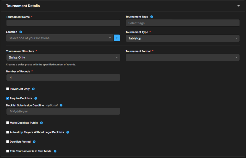 - Additional Deadlines: There are four optional time settings which allow you to adjust windows for registration and decklist submission. For example, if you set the Decklist Submission Deadline to 10 minutes after the Start Date, players will be able to finish deck submission even if the tournament has started until that time has elapsed.