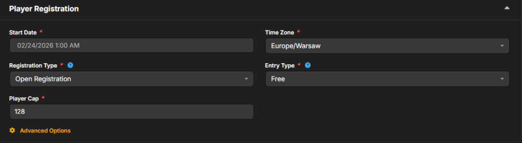- Player Registration: Set the player cap to reflect the number of players allowed to participate