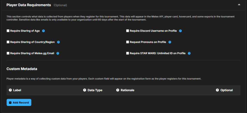- Player Registration: Players can register themselves through Melee (Open Registration) or not (Invite Only)