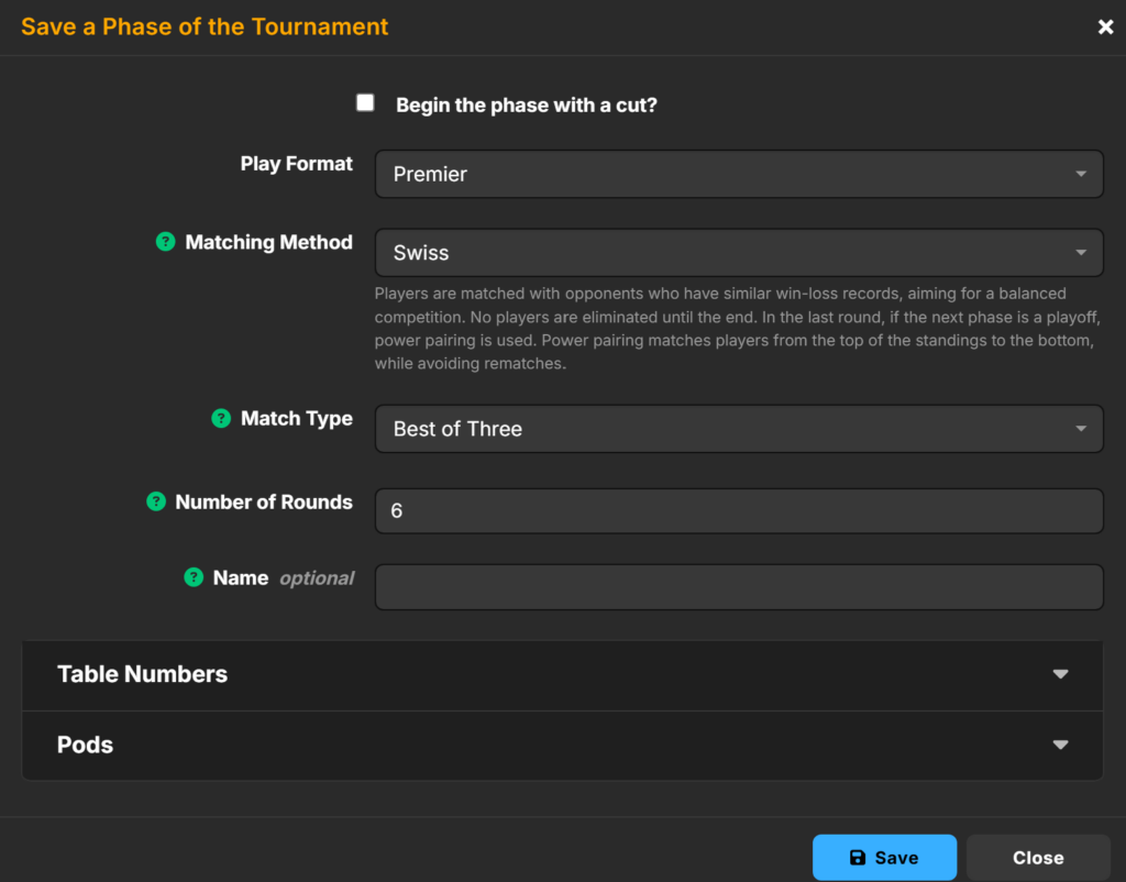 • Play Format: This is the format used for the tournament. Once selected the tournament will be tagged as the selected format for searching. It will also be displayed on the tournament’s public page.